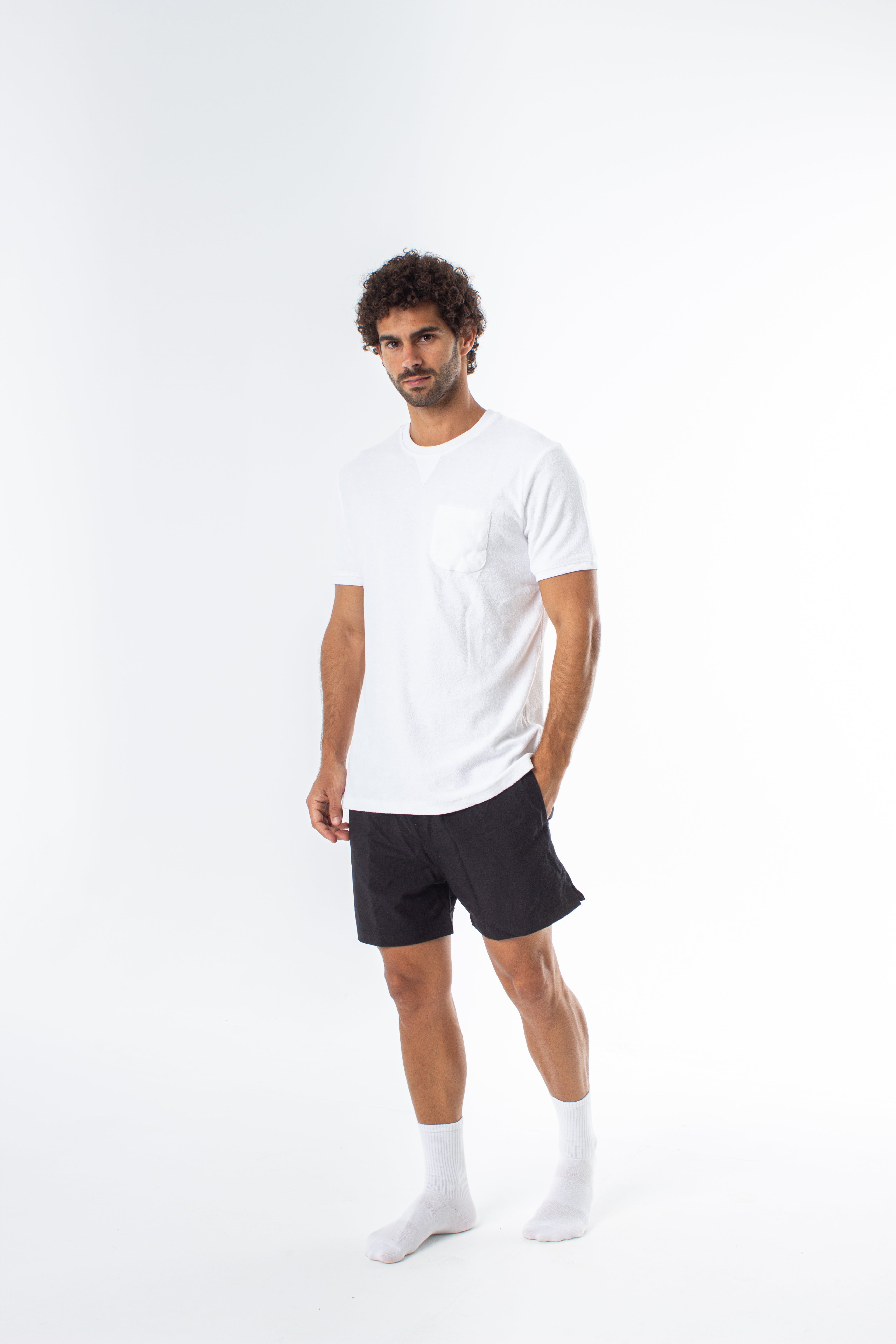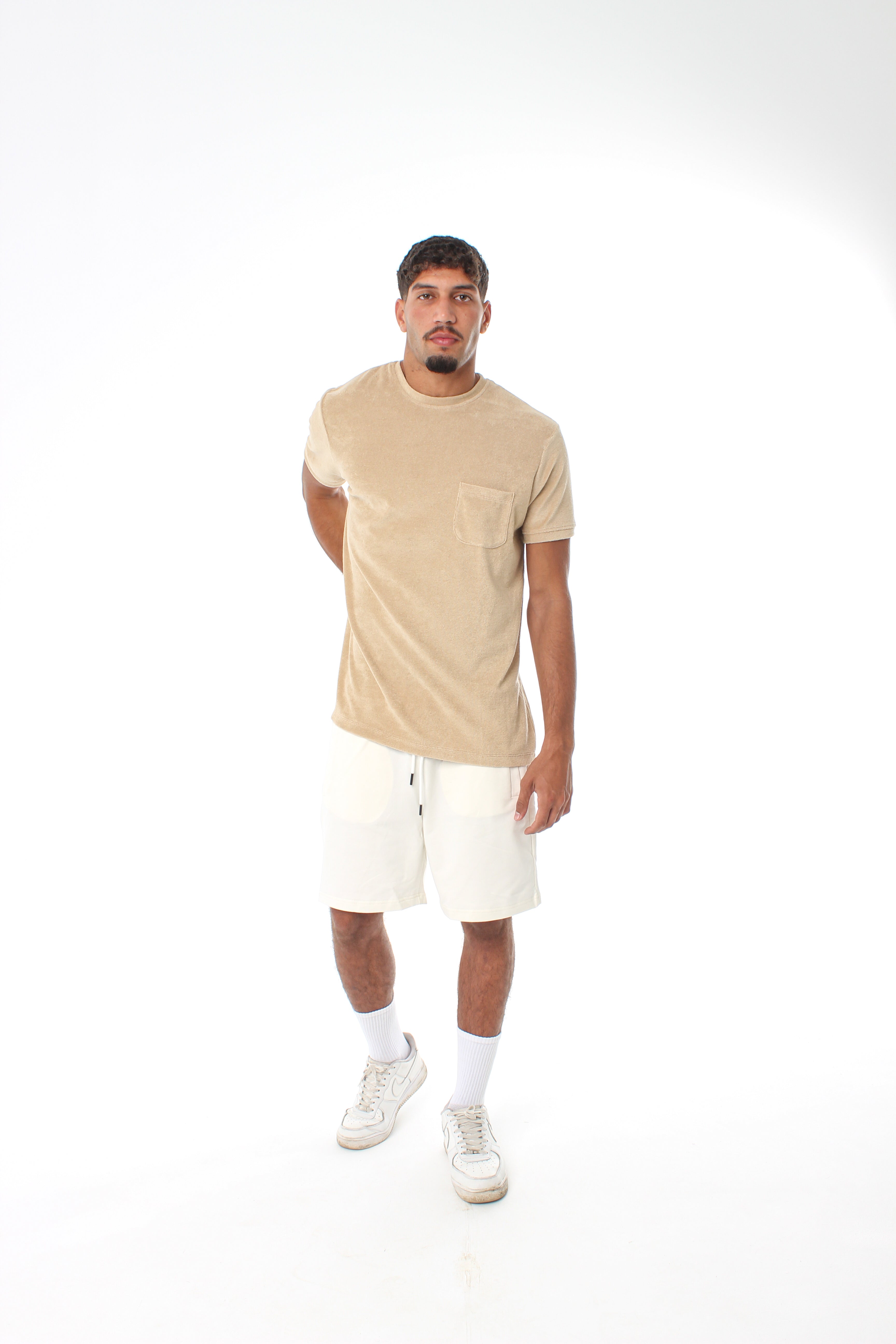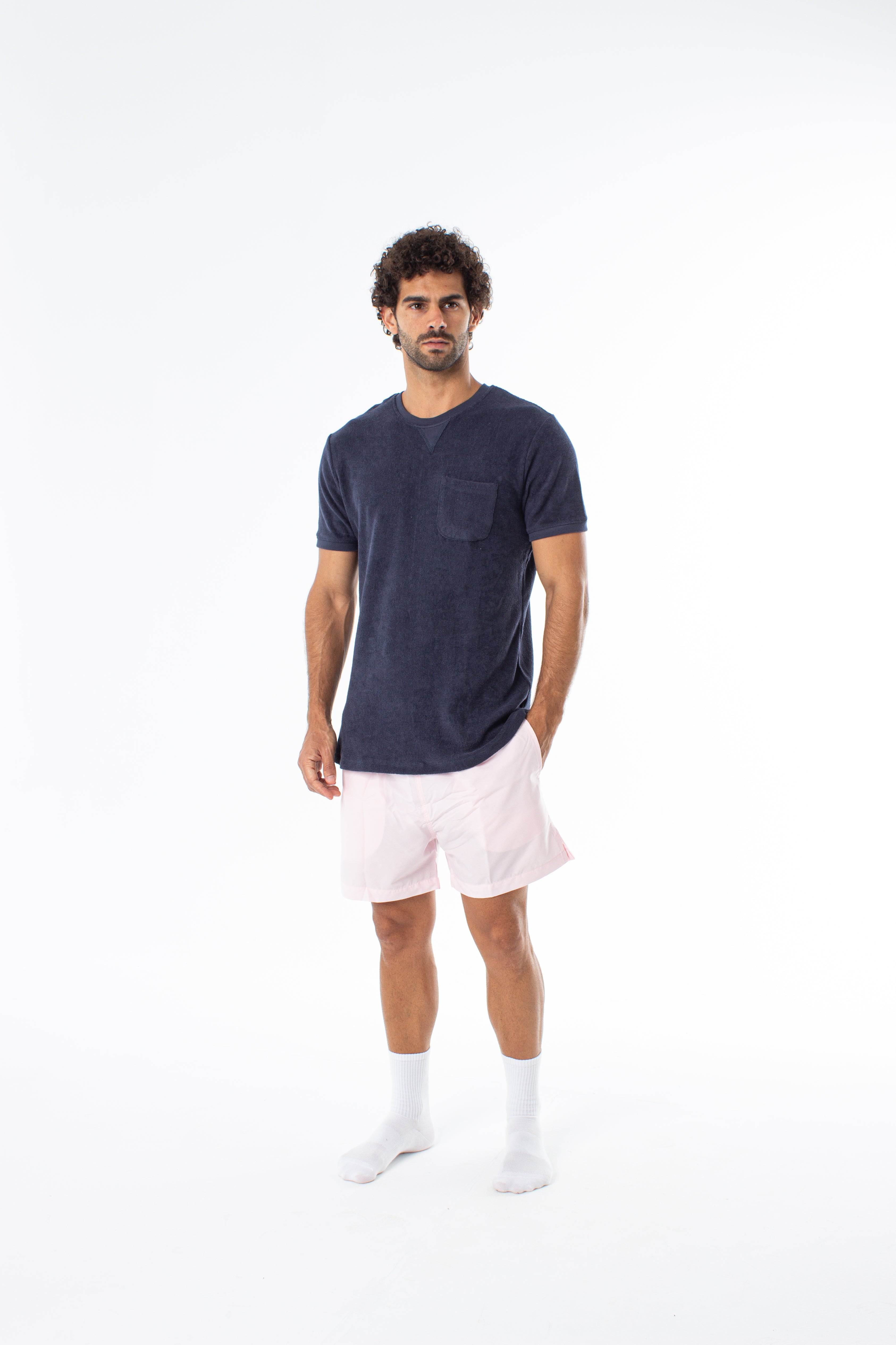Made from brushed cotton with a soft towel-like texture, designed for cool and comfortable summer wear.